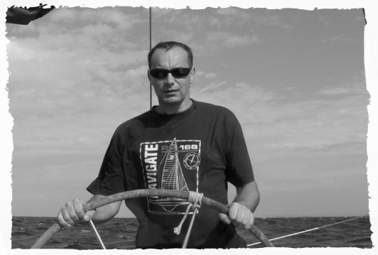 Oficer Nawigator Marynarki Handlowej. Zawodowiec. Nikt nie wie dlaczego po półrocznym pobycie na statku gna na złamanie karku aby popłynąć jachtem. Profesjonalny Pierwszy Oficer.